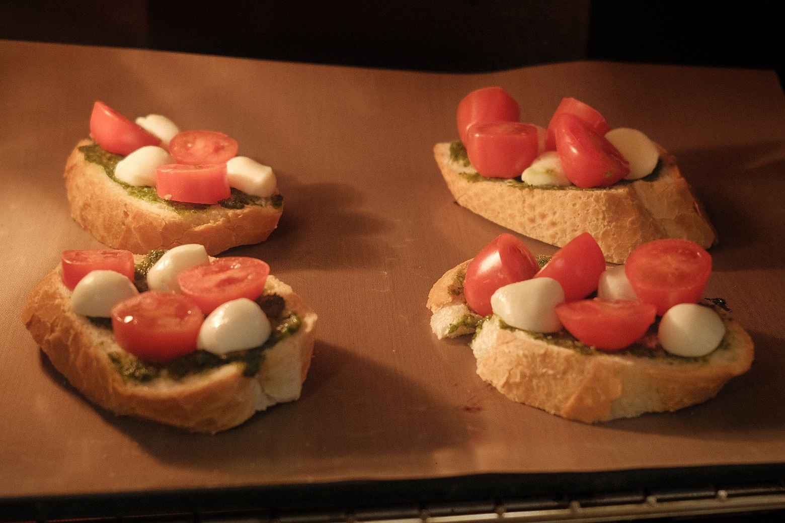 얇은 빵 위에 재료를 올려 먹는 요리로 바질페스토, 토마토, 보코치니치즈 세가지를 올려 정말 쉽고 고급스러워 보이는 요리를 만듭니다. ( 진짜 너무너무 맛있어요ㅠㅠ)